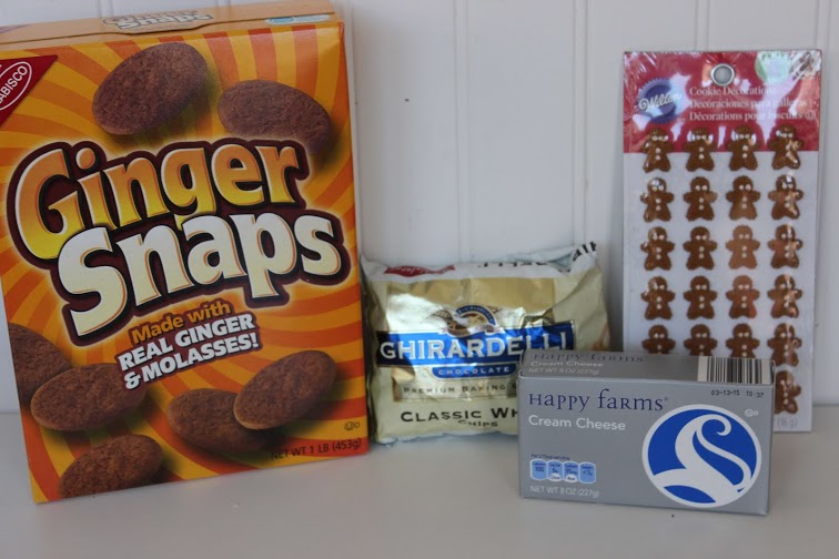 8 oz softened Cream Cheese 8 oz Ginger Snap Cookies 12 oz White Chocolate Chips Gingerbread Decorations Directions: